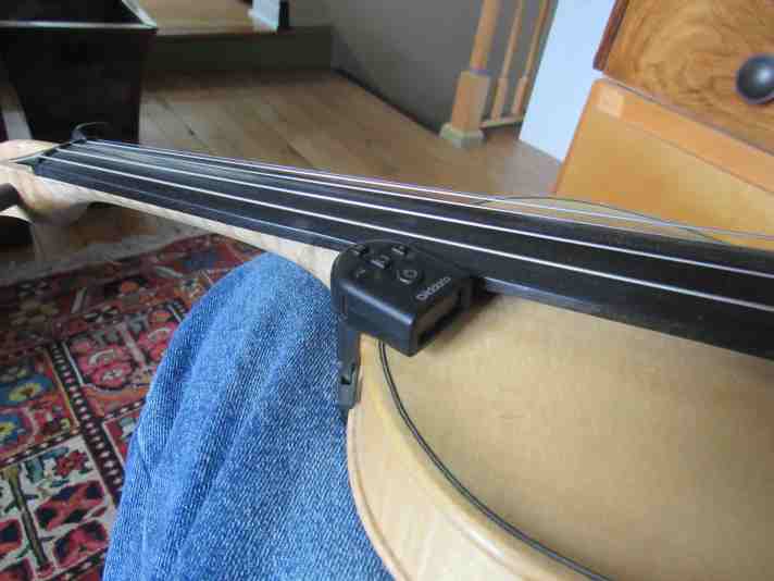 I have violin tuners that fit on the upper bout beside the neck. In this position, you can see the notes as you play them and tell whether your intonation os good, close or not so close. There is also a built-in visual metronome you can play to. $24