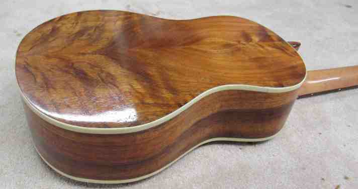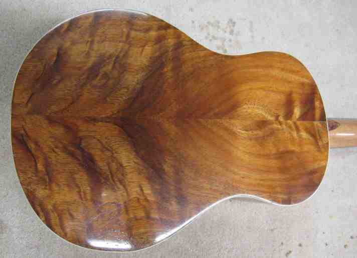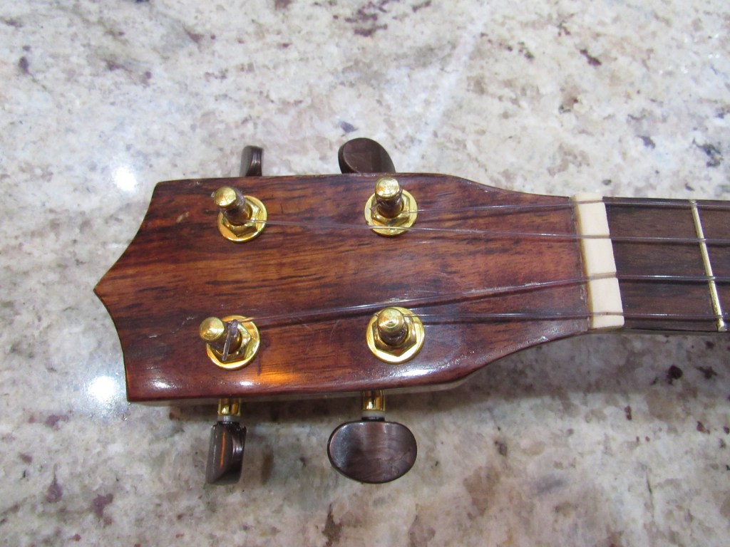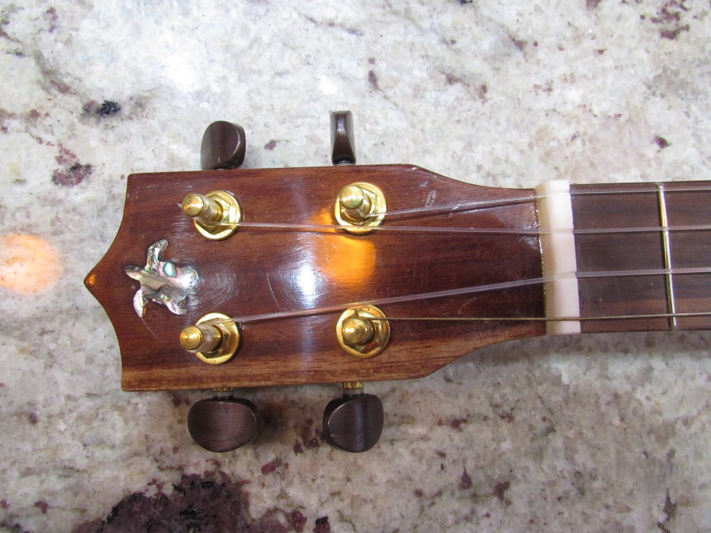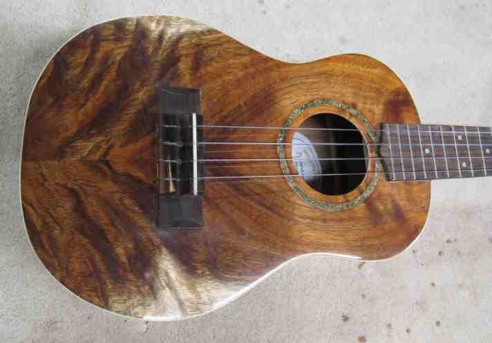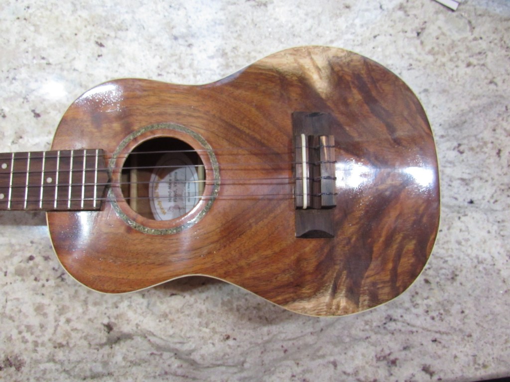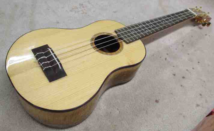 I began making Ukuleles about 8 years ago to use the smaller pieces of wood I had left over from guitar building. Ukuleles come if four sizes. Soprano, Concert and Tenor sizes all tuned a forth above normal guitar tuning (C-G-E-A) and Baritone, tuned like the top four strings of a guitar (D-G-B-E). Each size has a slightly increasingly larger body and a scale-length that increases by one inch. I primarily build the Portuguese (guitar-shaped) design in a concert size with a tenor neck to add more energy to the instrument. This is the most popular style with Hawaiian players.