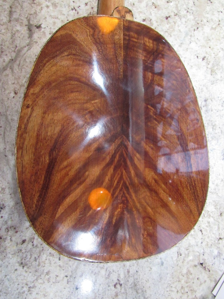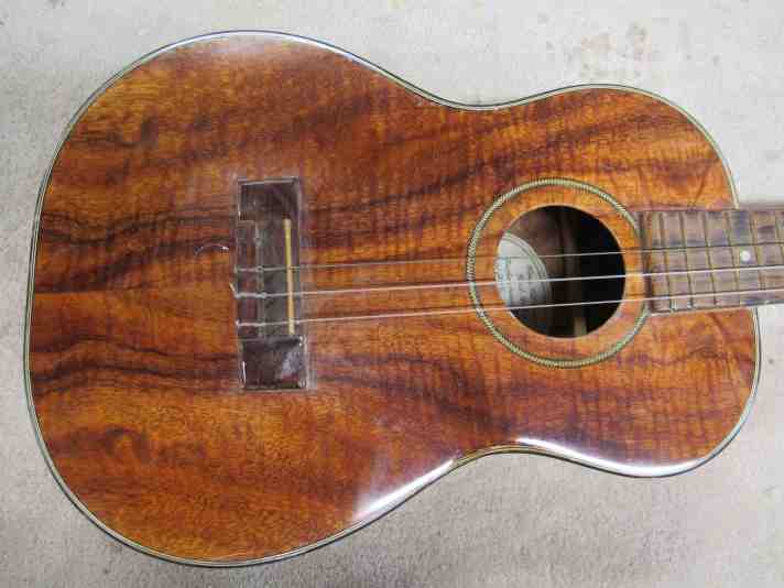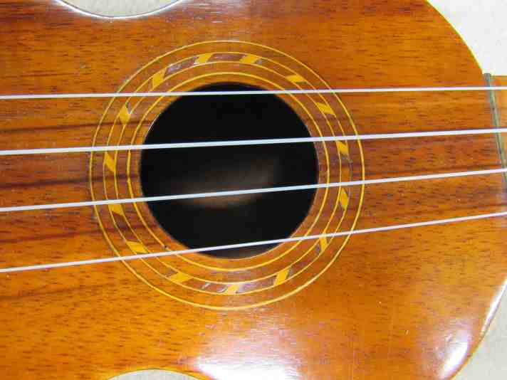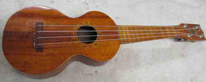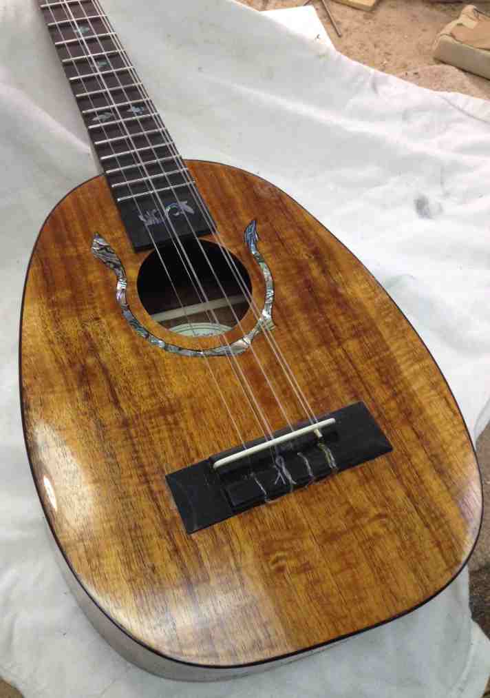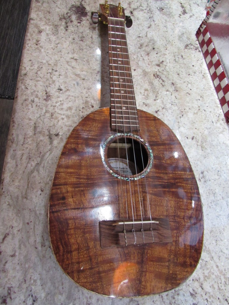 The Kamaka Ukulele Company in Honolulu, designed a new oval-shaped body style called a Pineapple Ukulele. ( The prototype was actually embossed and painted to look like a Pineapple-Center Picture). A further refinement was to add up to four additional strings to the Ukulele for additional volume. Any Ukulele with more than four strings is called a “Taro” Uke indicating that it is a folk instrument. ( Taro is the root used to make the Hawaiian staple food Poi ).
