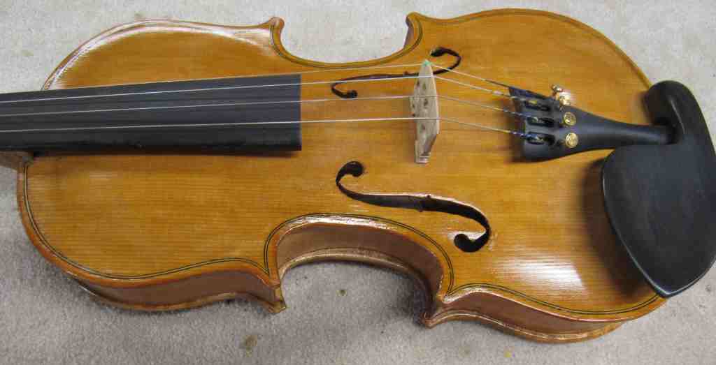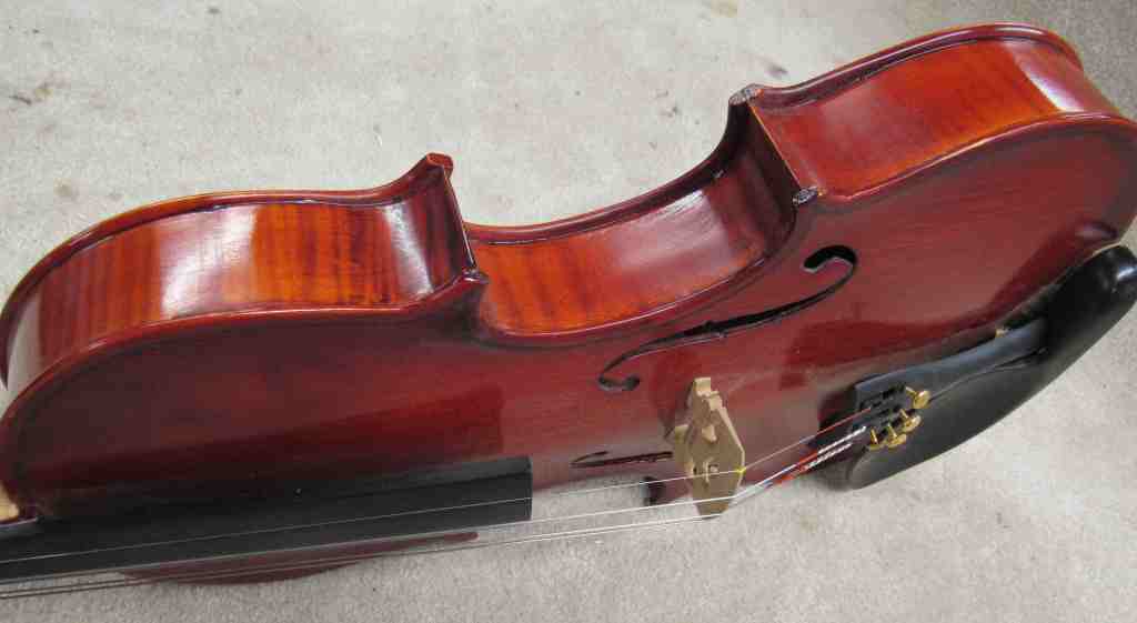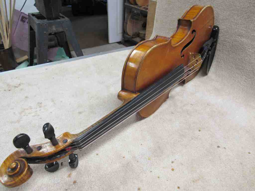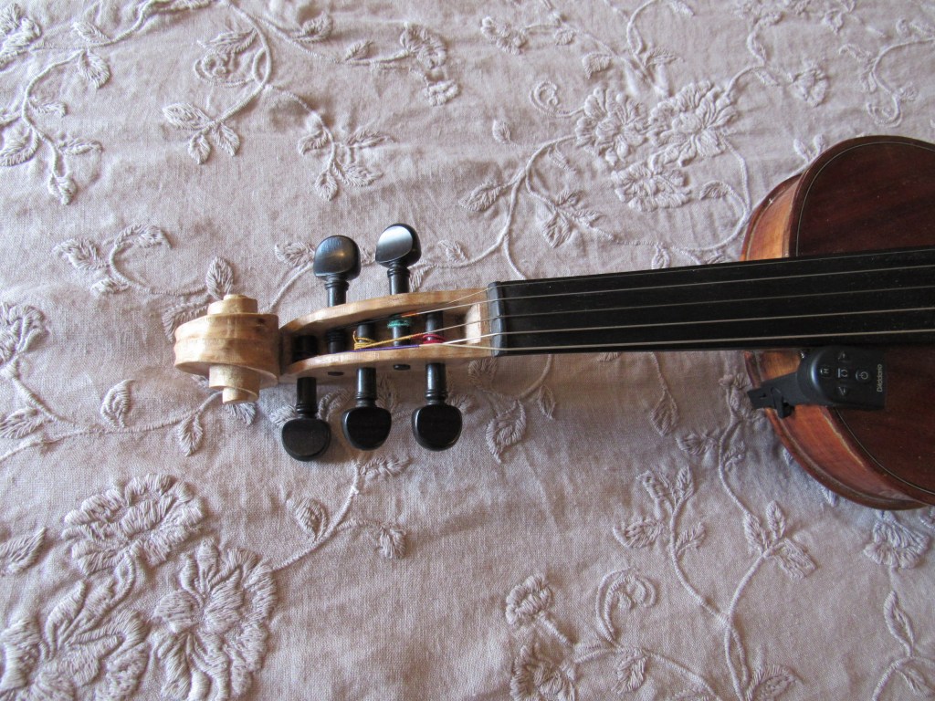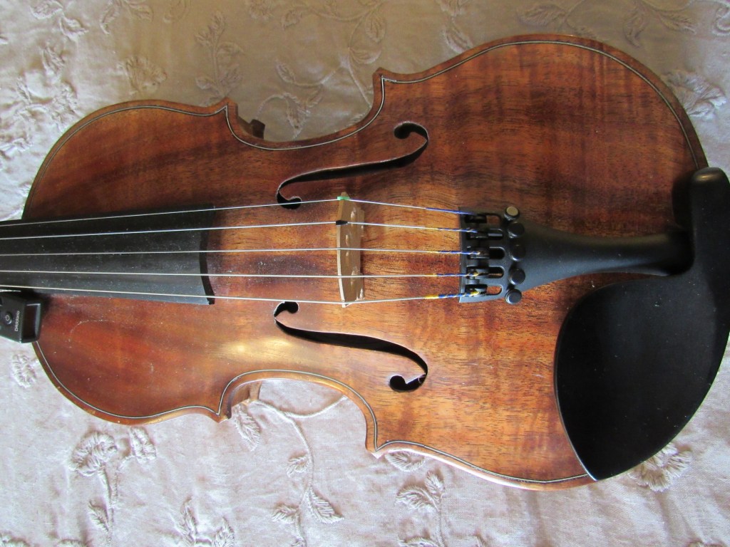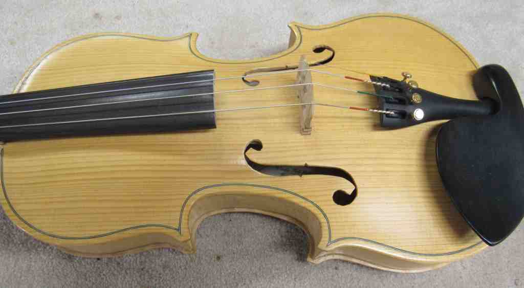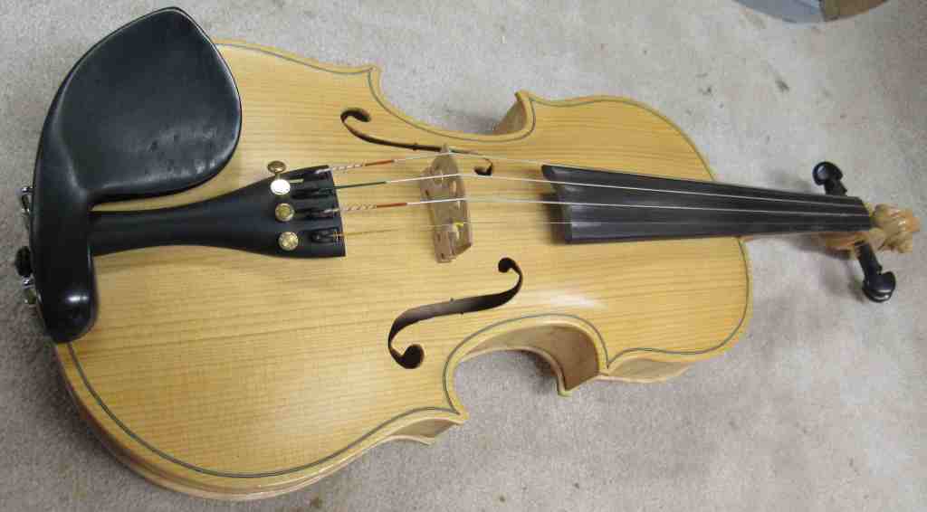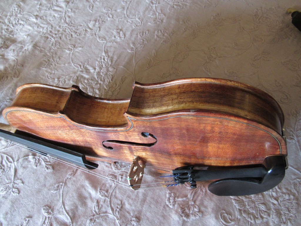 This is a German violin I bought unfinished. I regraduated the top and finished it using Boxwood pegs and ebony fingerboard. The instrument is very clear and loud but a little harsh in tone. A good transition violin for an advanced beginner to intermediate player who wants a five string. Easy to play. includes case. $1200